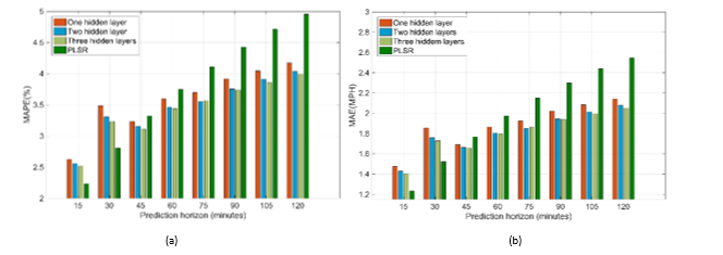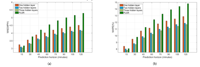 Figure 8 compares the shallow network and the two deep networks for the speed prediction, with the top panel showing the MAPE and the bottom panel showing the MAE. The PLSR model is shown as well for the sake of comparison. As the figure illustrates, the deep neural networks had smaller prediction errors compared to the shallow neural network. Moreover, the three-hidden-layers network did not remarkably reduce the average prediction error. However, the confidence intervals of the various models still need to be considered before deciding on a preferred model. Figure 8 also shows that at the 15-minute and 30-minute prediction horizon PLSR performed quite well, as there was high correlation between the input predictors and the responses. However, for the longer prediction horizons, neural networks returned better results than PLSR.