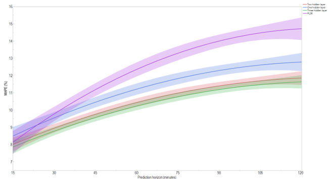 As shown in Figure 7, at the 15-minute prediction horizon, all models are quite similar where their four confidence intervals intersect. At a larger prediction horizon, we can group the four models into three different groups. The first group includes the PLSR model; the second group includes the one-hidden-layer neural network model; the third group includes both the two- and three-hidden-layers neural network models. This figure suggests that the three-hidden-layers neural network is the best model, particularly at the 120-minute prediction horizon, as its confidence interval does not intersect with the one-hidden-layer neural network’s confidence interval.