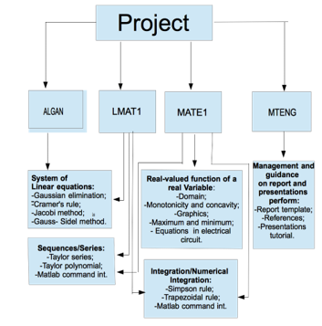 The study of real-valued functions was done analytically in the MATE1 subject. Some equations were solved numerically in LMAT1. The numerical methods used were the bisection and Newton–Raphson methods. Another topic involves the integration of functions without any symbolic primitive. This problem was addressed in MATE1 and LMAT1. Taylor series/polynomial were used to find an approximation of the integrand function and so to obtain an approximation of the integral. In LMAT1, the Simpson and trapezoidal rules were used for numerical integration. The management and guidance for performing the reports and presentations were carried out in the MTENG subject. This general issue had also the contribution of all participant subjects.