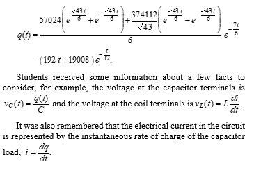 The tasks proposed to the students include three groups of questions. The first task to be developed in this project involved real-valued functions of one real variable. The voltages across the capacitor component were studied. Thus, the charge/discharge of the capacitor, , in the RLC circuit (Fig. 1) was given. The analytic expression involved various exponential functions, for example,