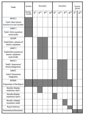 An overview of the project milestones and tasks is shown in Table II. Task 1 included the study of a real-valued function of one real variable and solving some equations numerically. This was performed during the four weeks of October, the first month of the project.