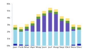 Figure 1 and Figure 2 Represent the total annual energy consumption MJ and total annual electrical consumption. The Y- axis total energy (MJ), X-axis time (year) for example in Jan the red bar shows the space heat ,yellow bar area light, blue bar space cooling.