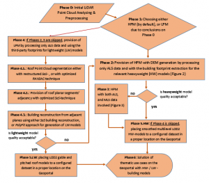 It is shown in Figure 1, that an activity diagram combines both HPM, and LPM issues, while an input is a raw LiDAR Point Cloud (Phase 0). Analyzing & Preprocessing phase implies evaluating point densities, survey induced and filtering induced errors, as well as checking a for a point cloud proper georeferencing. Two key factors, that determine a solution to be made on Phase 1 (either HPM, or LPM chosen) are the territories of specific urban configurations, that are overlapped by .LAS files, and if the third-party (OpenStreetMap, Microsoft, etc.) footprints are available for a given area.