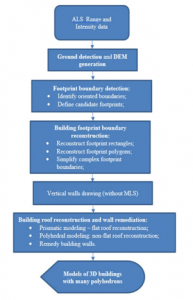 At its first stage, the building footprints (building base boundaries) are detected by segmenting DEM data obtained from LiDAR for two general classes: ground class and non-ground ones. The bare ground as a grid is delineated upon this step. A well-known, so called “sequential linking technique” is often suggested to reconstruct building footprints into regular polygons. These polygons then are improved so that to reach the cartographical standards [52, 72].