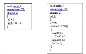 The semaphore operations init, wait, and signal, which are defined below, are functions from the OS kernel: