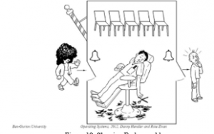 The problem can be stated as follows: In a barbershop, there is а barber chair and an area for the waiting clients with five chairs. The algorithms of the concurrent processes of the Barber and the Client include the following steps: