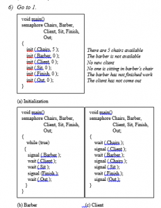 The first thing students have to do is to identify processes synchronization events and implement one semaphore variable for each of the controlled events. Then they develop three programs – Initialization (for setting semaphore values), Barber, and Client (Figure 20).
