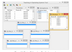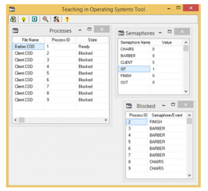 TOST allows students to monitor (Figure 24) how philosophers are waiting for the forks (in Processes and Blocked) and how they take and put the forks on the table (in Semaphores).