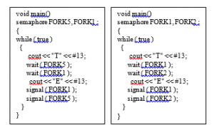 The students solve this problem by developing five programs (for the philosophers) while the correct access (mutual exclusion) to the shared objects (forks) is implemented by semaphores. The example programs for the first two philosophers are presented in Figure 23.