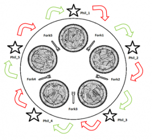 The Dining Philosophers toy-example [26], depicted in Figure 22, is often used to analyze the synchronization and deadlock problems in the concurrent processes execution, as well as to demonstrate the approaches for solving them.