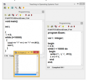 Figure 4 presents an example program in PASCAL-style and C-style and its execution. The students develop their programs in text editing windows, while the TOST compiler (icon ), automatically recognizes the language in use. Pressing the icon starts the process execution in a separate window.