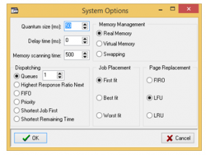 Priority spin-edit box sets the initial process priority while the total process execution time (used in some scheduling strategies) can be entered in Time. By checking Background the students can specify the process visual mode (execution in a separate window or behind the scenes). Pressing the RUN button multiple times will cause the start of several concurrent processes.