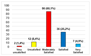 In Figure 1, the quality of nursing care in hospitalized patients of the Carlos Lanfranco la Hoz Hospital, it can see that 86 patients representing 60.1% are moderately satisfied, followed by 36 patients representing 25.2% are satisfied, 12 patients representing 8.4% are unsatisfied, 7 patients representing 4.9% are very satisfied and finally 2 patients representing 1.4% are very unsatisfied.