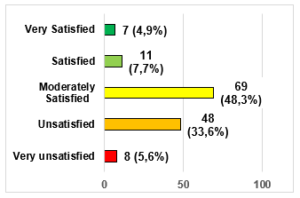 In Figure 2, the quality of nursing care according to its dimension experience with nursing care, in hospitalized patients of the Carlos Lanfranco La Hoz hospital, it can see that 69 patients representing 48.3% are moderately satisfied, followed by 48 patients representing 33.6% are unsatisfied, 11 patients representing 7.7% are satisfied, 8 patients representing 5.6% are very unsatisfied and finally 7 patients representing 4.9% are very satisfied.