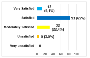 In Figure 3, the quality of nursing care according to its dimension of satisfaction with nursing care in hospitalized patients of the Carlos Lanfranco La Hoz hospital, it can see that 93 patients representing 65% are satisfied, followed by 32 patients representing the 22.4% are moderately satisfied, 13 patients that represent 9.1% are very satisfied, 5 patients that represent 3.5% are unsatisfied and finally 0 patients that represent 0% are very unsatisfied.