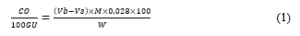 where, Vb and Vs are the volumes (mL) of HCL used to titrate the blank (native starch) and the oxidized starch, respectively; M is the molar concentration of HCl (mol/L), and W is the weight of the sample on a dry basis (g).