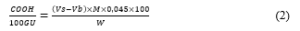 On the other hand, carboxyl groups were determined using the protocol proposed by [15]. Briefly, 1g of DAS was suspended in 60mL of distilled water, gelatinized and cooled, as previously mentioned. Later, a potentiometric titration took place until pH 8.2, using NaOH 0.01M. The amount of carboxyl groups per 100 glucose units (CO/100GU), was calculated through equation 2: