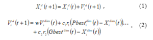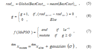 Assuming there are k elite particles, the entire swarm population would be divided into k+1 parts and each k part would be replaced by off-springs of the kth elite particle, while the k+1 part consists of particles generated from a random distribution, thereby maintaining diversity in the swarm. such that if xdim is the dimth dimension of the swarm, then all the elements in the dimth dimension shall mutate according to (8).