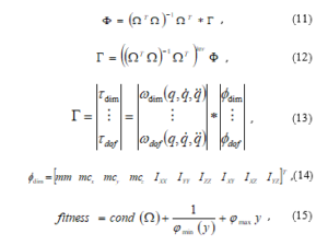 where Γ is the compound torque for the manipulator comprising of individual joint torques τ, the compound observation matrix Ω comprises of individual joint vectors ω(q, q̇, q̈), and is a function of the joint position, velocity, and acceleration only. ϕ is a vector of unknown robot parameters for each link that require to be identified, it includes link mass mm, first moments [mcx mcy mcz]T along the x-y-z axis, and six inertia tensor Iij, these compose the compound vector of unknown parameters Փ. The intelligent swarm-based algorithm would be required to minimize the condition number of the observation matrix while maximizing the smallest singular value and minimizing the largest singular value. Therefore, the fitness function would be as described in (15).