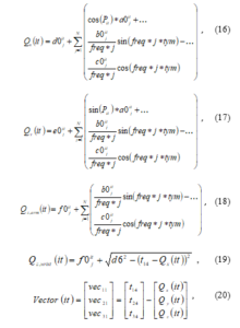 A modified Fourier series (MFS) formulation was used to define the excitation trajectory with a cubic polynomial. The equation of motion for the trajectory of the first three joints are given in (16-18), a circular trajectory path was implemented so as to allow continuous trajectory tracking of the robot during experimentation. The trajectory is to be optimized by applying the eMuPSO algorithm to minimizing the condition number of the observation matrix. The trajectory is implemented in Cartesian space, and joint positions are determined from inverse kinematic solutions. The wrist of the manipulator has a z-x-z orientation, therefore the excitation trajectory along the x and y axis can be derived independently from (16) and (17) while that of the z axis is estimated from (19), where d6 is the offset length of the sixth link of manipulator (see DH parameters) and t14 is the position coordinate of transformation matrix T40 from the Base to Link-04.
