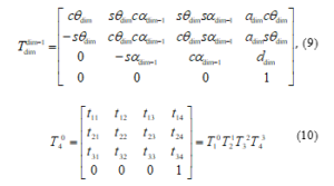 A 6 DOF industrial robot manipulator was analyzed, the structure of the robot manipulator is shown in Figure 1 and its D-H parameters are given in Table 1. A homogeneous transformation matrix describes the state (orientation and position coordinates) of a robot link with respect to the previous link in the Cartesian coordinate space and can be used to describe the state of the end-effector (tool) of the manipulator with respect to the base (global coordinate) frame. If all the joint parameters are known (D-H Parameters), the homogeneous matrix of each successive pair of frames for the forward and inverse directions can be obtained from (9). The robot manipulator’s end-effector coordinates would be a product of post multiplication as shown in (10).
