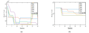 Figure 2.0 (a) and (b) show the convergence plot at the wrist and at the arm of the manipulator respectively. The eMuPSO was populated with twenty particles in thirty iterations and five runs. The Figure 2.0 shows all five runs, the sixth being the average of all five runs. It would be observed that in the third run of Figure 2.0 (a), the algorithm converges to the global minimum solution in eight iterations, then it is mutated in the 14th iteration where it stagnates until it is mutated again in the 24th iteration. The best solutions are stored in the archive before mutation. The Figure 2.0 (b) show less agitation of the algorithm signifying less mutation and simpler analysis.