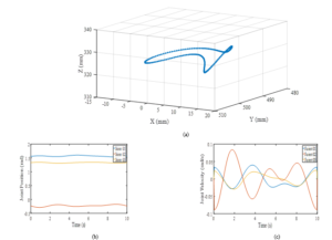 Tables 2 and 3 presents the parameters of the non-dominated elite solutions for the joints at the arm and wrist of the manipulator, including the three harmonics each for a0 and b0, with corresponding fitness values, condition number of the observation matrix and cumulative errors for the best 20 identified parameters and for all 22 identified parameters. Figure 3.0 (a) presents the resultant trajectory in Cartesian space for the 5th elite particle at the robot’s wrist, showing a somewhat circular continuous trajectory with fluctuations that are typical of FFS. Figures 3.0 (b) and (c) show the position and velocity of the three joints at the robot’s wrist in joint space, while Figure 4.0 shows the equivalent for the 1st elite particle at the robot’s arm. From the results presented in Table 2 (at the wrist), it would be observed that while the 6th elite particle has the lowest fitness value and the lowest cumulative estimation error for all the 22 identified parameters, the 2nd elite particle presents the trajectory with the lowest condition number, and the 1st elite particle presents the lowest cumulative estimation error for the 20 best identified parameters. Likewise, in Table 3 (at the arm), although all the 22 identifiable parameters were identified with higher accuracy, yet it would also be observed that the 6th elite particle has the lowest fitness and presents the trajectory with the lowest condition number, but the 1st elite particle presents the lowest cumulative estimation errors for both the 20 best identified parameter and the 22 identifiable parameters. This supports the observation of [41] that the best solution does not guarantee the global minimum solution because the dynamic optimization problem is not convex.