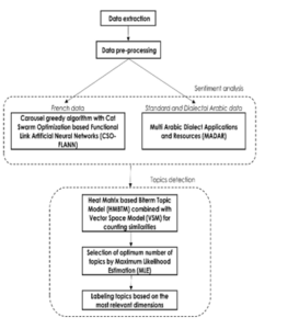 Therefore, and to test our approach, we have looked at two socio-political issues: (I1) ‘opinions about politics’ and (I2) ‘perceptions of freedoms’. For the first theme, we have collected data (posts and comments) corresponding to the following queries: ‘politique’, ‘gouvernement’, ‘politique gouvernementale’, ‘سياسة’, ‘حكومة’, and ‘السياسة الحكومية’. The second theme was examined using three tags: ‘libertés’, ‘حرية’, and ‘الحريات’.