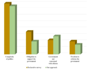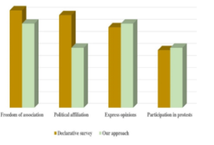 For the second issue (I2) ‘perceptions of freedoms’, four topics were the most salient: freedom of association, political affiliation, express opinions and participation in protests. Figure 3 compares the weight of these topics to that resulting from the declarative survey [24].