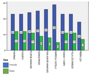 Figure 2 considers the distribution according to sex of the total number of people who participated in the study, segmented by each health center in the Rímac district, an analysis that considers 35 HC respondents: Rímac, Caquetá and Flor de Amancaes; the second block considers the HC with 34 respondents: Leoncio Prado, San Juan de Amancaes, Mariscal Castilla, Ciudad y Campo and Villa Los Angeles; and finally the block of 25 respondents the HC Piedra Liza, an activity that was carried out according to schedule and considered the minimum established quota.