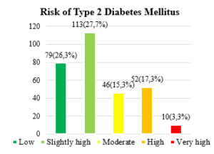 In Figure 5 regarding the risk of type 2 diabetes mellitus, it is observed that 79 (26,3%) of the patients present a low risk, 113 (27,7%) present a slightly high risk, 46 (15,3%) present a moderate risk, 52 (17,3%) present a high risk and 10 (3,3%) of the patients present an extremely high risk.