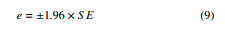 Using the above equation, the margin of error, e, for the 95% confidence interval (95% CI) is expressed as in Equation 9.