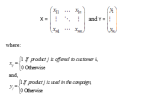 Given a set of m customers C = [c1, c2… cm], and a set of n products’ offers P = [p1, p2 …pn], the objective is to maximize the Return on Investment under these business constraints: