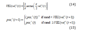 where α and γ are predefined constants. The search principal in BA, is once a micro-bat has found the prey’s location, the loudness will be decreased while the pulse rate will be increased. However, The Bat Algorithm is designed, at the origin, to search in a continuous space of solutions. The algorithm, in its original version is not applicable when the set of solutions is discrete, because during an optimization in a binary search space, by treating only values 0 and 1, the Eq. (9) is no longer valid to update the position of the microbats. To encounter this obstacle, authors in [8, 14] proposed a new solution: the idea is to use a transfer function with the aim of updating the position of micro-bats with the probability of their velocities. In practice the transfer function has the role of mapping velocity values to probability values. In other words, the transfer functions are used to move the microbats in a binary space instead of a discrete space. The most important factor for designing this function is to force micro-bats with high velocities to switch their positions. To do this, a transfer function, called v-shaped function, and position updating rule are proposed in [8,10], and described in Equations (14) and (15) as follows: