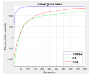 The GAPs of IGBBA are significantly lower, and the BBA appears as the second-best algorithm by comparing the GAPs. Figure 5, which is a graphic representation of the fitness function using the three discussed algorithms, shows the fast convergence of the BBA and the IGBBA compared to the Genetic Algorithm. As reported in Table 1, and for the three categories of the S3 format, IGBBA is clearly better than the methods used in the previous works, with a clear difference in performance based on the GAP calculation. However, for the medium and large categories, the IGBBA is considered very competitive and sometimes better than the other algorithms.