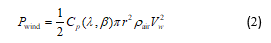 where is the wind speed, all of them in “meter/ second” and time t is in “second Here this wind speed signal have four component, i.e. the basic speed of wind ( ), a fluctuating wind ( ) that describes a steady increase in wind speed, gust component ( ) and a gradient wind component ( . The mechanical energy given wind turbine is determined as follow [3]