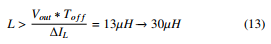 Once the ripple (Table 1) and Tof f (12) are given, both the peak and the average current are fixed. Furthermore, by using these parameters in (4), the inductance value can be chosen as:
