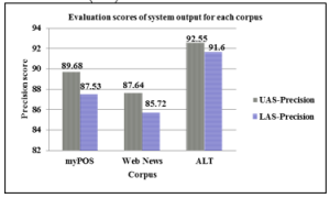 Precision scores of UAS and LAS in system outputs of myPOS and Web News data are over 89% and 87%, and 87% and 85% respectively in comparing manually updated standard data. System output precision scores of UAS and LAS for ALT data is over 92% and 91% in comparing with automatic unsupervised annotated standard data.