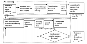 In post processing, to be consistent and fast checking and updating, selected updated data were repeatedly trained with all other not updated data in corpus by UDPipe. After checking and updating manually selected 2,000 sentences, they were added to the training data, Then the training model was retrained to parse the remaining sentences in corpus by the updated model. Parsed results were updated manually and trained again until all sentences were post processed in corpus. The overall architecture of annotation is illustrated in Figure 2. Detail explanation with examples will be presented in Section 4 and Section 6.