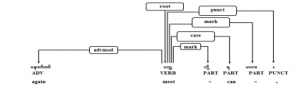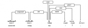 In addition, zero or more particles can be followed by verbs before verb ended markers to express the full state of action. In example sentence of Figure 7, the verb phrase, “ တွေ့ လို့ ရ မလား”, means “can meet” and “တွေ့” is main verb and the suffix sequence with three particles, “လို့ ရ မလား”, means asking politely for the requested action. That main verb phrase is also modified by left adverb phrase, “ နောက်ထပ်”. As a result, the verb, “တွေ့”, is root of that sentence. The whole sentence means “Can meet again?”,