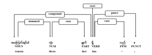 Myanmar noun phrases are usually ended with different types of nominal markers, postpositional markers (PPMs), to identify their roles in sentences such as subject, object but most colloquial style noun phrases are written without these markers. Myanmar sentences might have one or more phrases or clauses. Some subordinate clauses are usually used to represent more detail meaning for modified parts and also placed before modified ones. Having these nested parts, defining correct dependency between sub and main parts of the sentence takes more time. Figure 1 illustrates an example sentence structure.