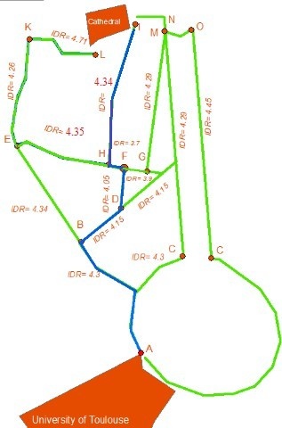 To identify the least stressful route the system will generate an index of difficulty and an index of stress for each possible route between start and destination points. By index we mean a numerical value. On the one hand the road difficulty index is a value that primarily depends on parameters specific to the road. On the other hand, the road stress index is a value that primarily depends on the index difficulty of the road among blind person specific parameters.