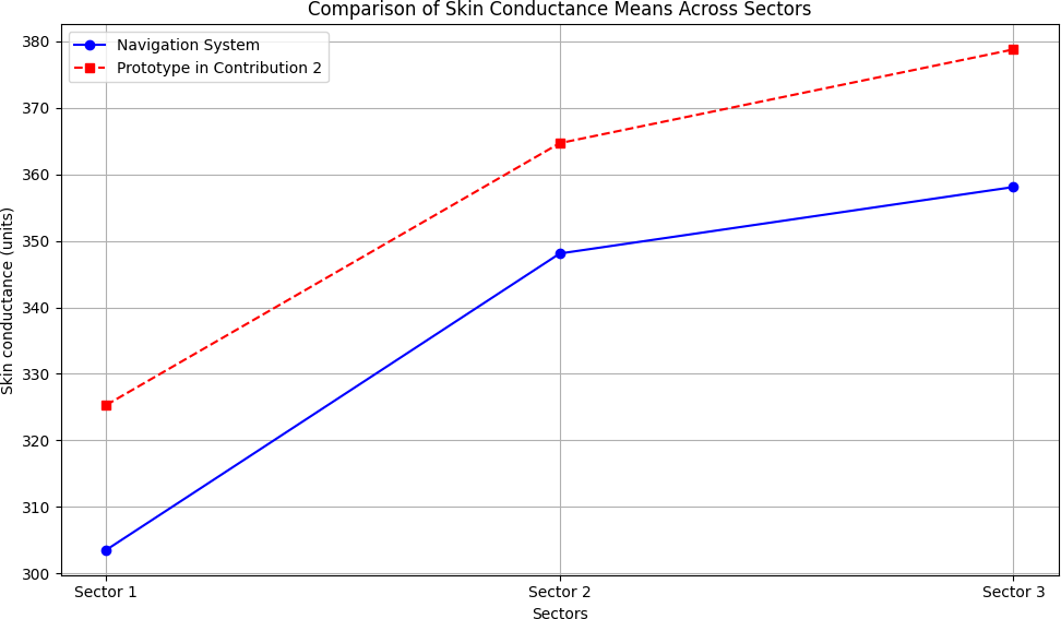 Compared to the results from the experiment described in our second contribution [1], and considering that users traveled from the same starting point to the same destination, this experiment shows the lowest mean values for all stress-related physiological signals and the lowest reported stress levels across all three sectors. This indicates that the navigation system was effective in reducing stress for blind individuals during navigation from the starting point to the destination point.