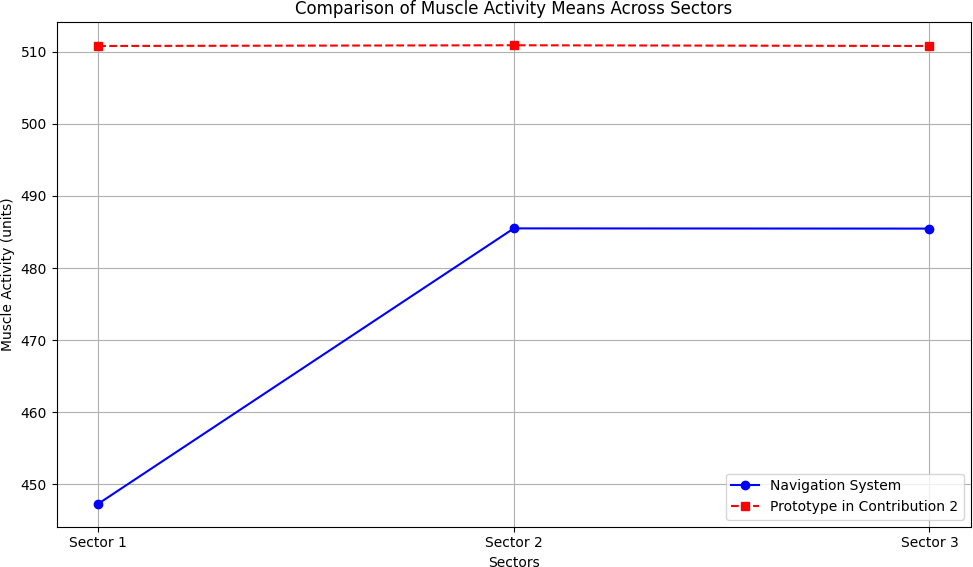 In our experiment with the full navigation system, we analyzed a route selected by the system as the least stressful, which was di- vided into three sectors. By incorporating self-reported stress levels from each user, we observed that all physiological measures (heart rate, skin conductivity, and muscle activity) were influenced by the distance to obstacles. This finding corroborates the results from our previous experiments described in [1]. If we consider the Tables 18 up to 21 and the corresponding Figures 11 up to 14, the following observations can be made. Specifically, users exhibited the lowest values for all biosignal measures and reported the least stress in Sector 1. Both biosignal measures and self-reported stress levels increased progressively from Sector 1 to Sector 2 and from Sector 2 to Sector 3.