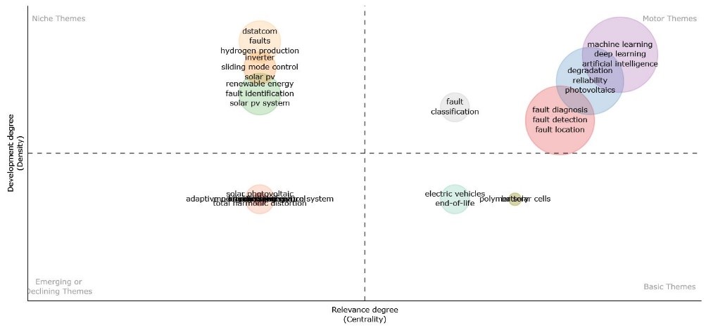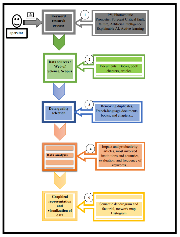 In the field of solar energy, bibliometric analysis has been integrated to identify emerging research areas and provide an impartial overview of current research status. A key work to date is that of [26], where bibliometrics was used to analyze a large number of documents on artificial intelligence methods for detecting and diagnosing faults in photovoltaic systems published since 2023.