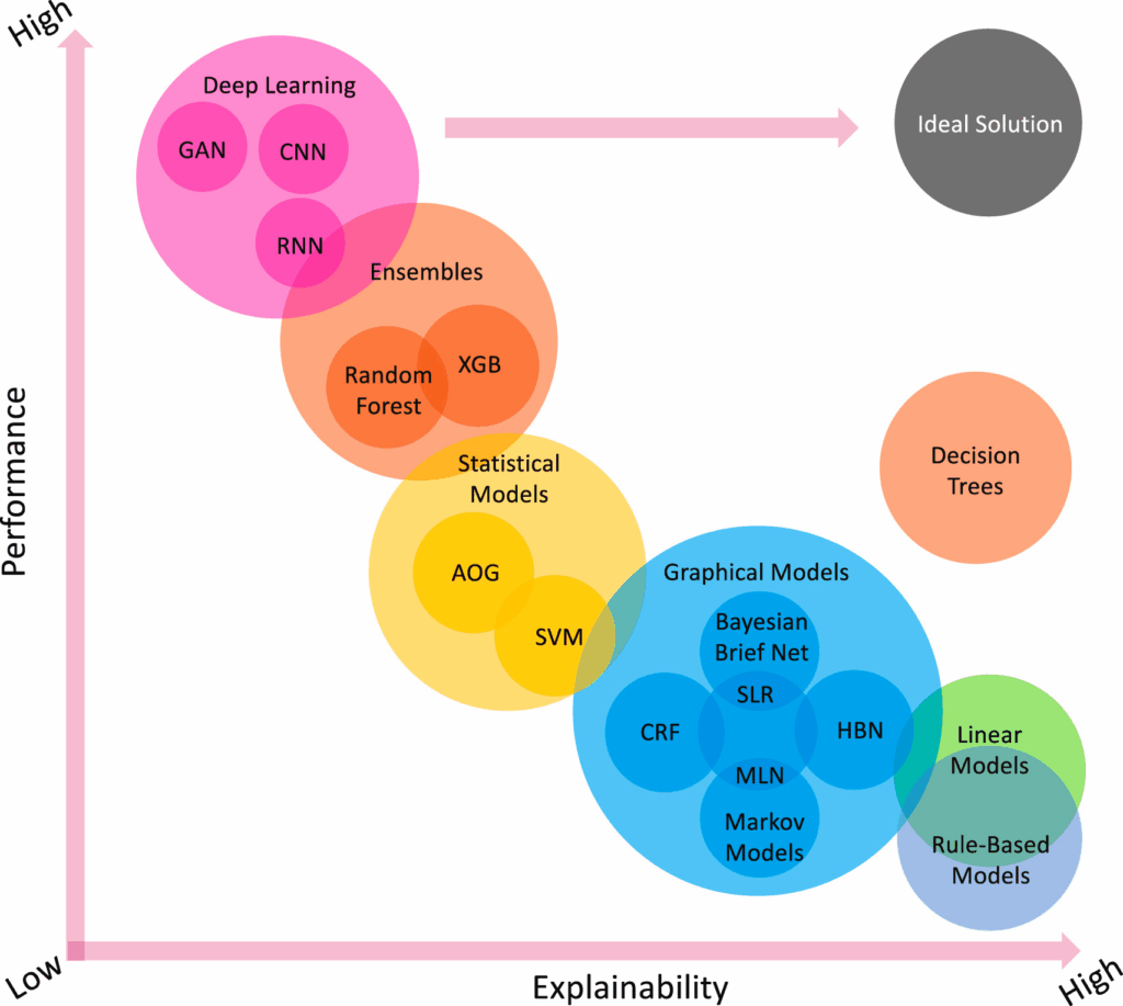Figure 2 above highlights the contrast between precision and explainability of the most commonly used models. Special attention is given to Artificial Neural Networks (ANNs), which constitute the majority of the most used AI methods in PV fault detection and prognosis. From this graph, it is clear that ANNs are very precise but have low explainability. The explainability of AI in general, or machine learning in particular, helps to answer questions such as: why did you make this decision? Why didn’t you act differently? When will you succeed or fail? How do you correct the error? These questions should be addressed in the development and implementation of different AI methods.
