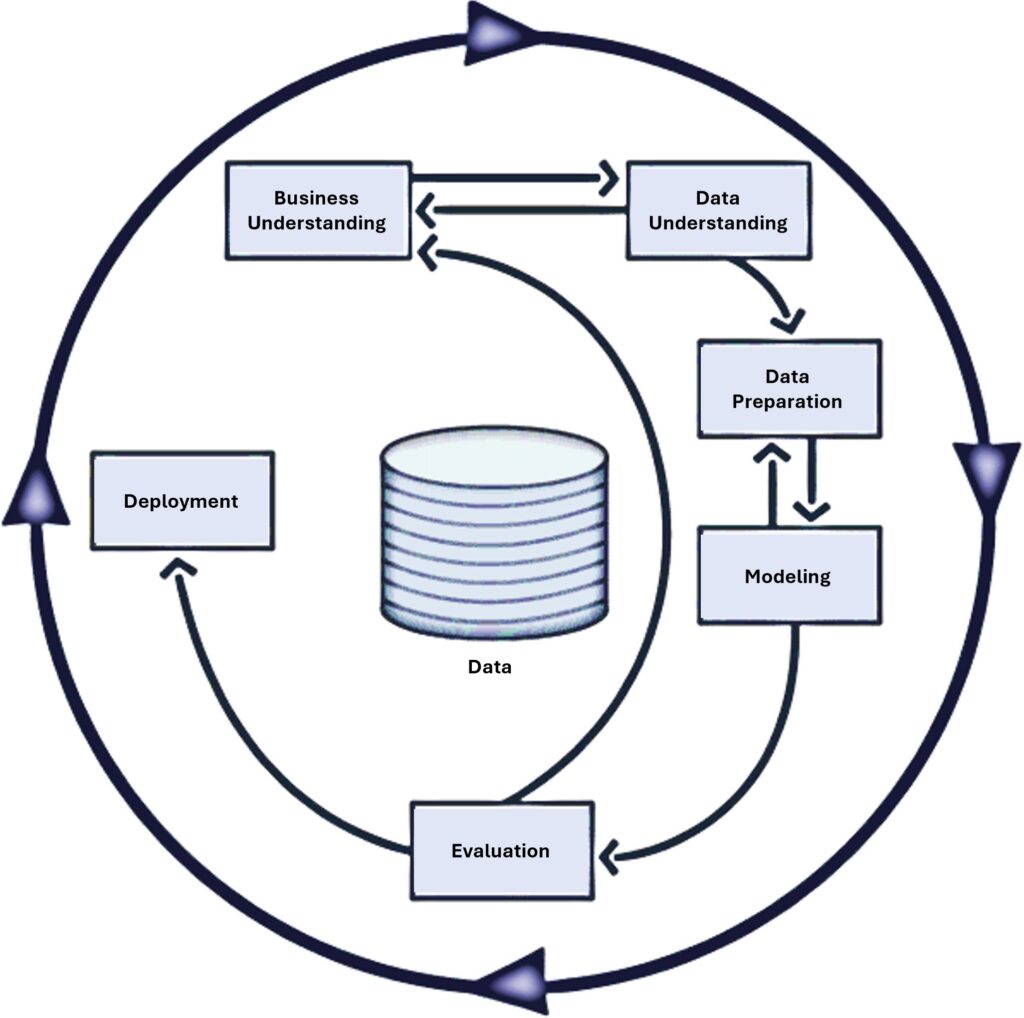 The development of the predictive models was guided by the Cross-Industry Standard Process for Data Mining (CRISP-DM) methodology [41], ensuring a structured, systematic, and replicable approach. The use of CRISP-DM enabled a logical progression from data understanding to model implementation, ensuring that each step effectively contributed to the quality and accuracy of the predictions. Figure 1 shows the process of this methodology.