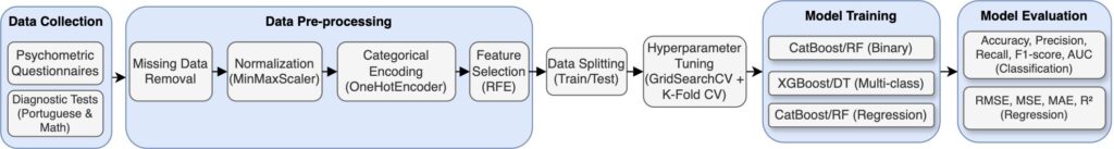 Figure 3 provides an overview of the ML workflow designed for this study. This modeling framework encapsulates the main stages of the process, from the collection of psychometric and diagnostic data to the training and evaluation of predictive models. This representation provides a clear and systematic overview of the process, enhancing methodological transparency and supporting the reproducibility of the study.