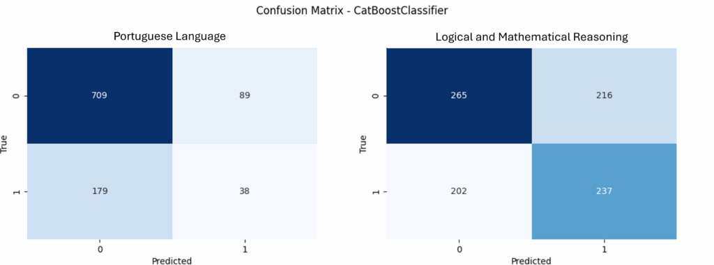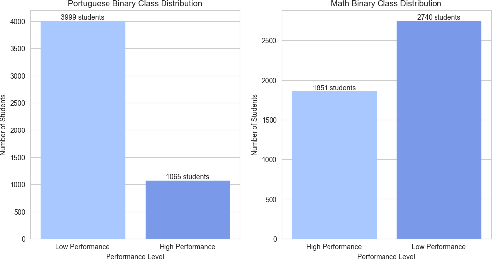 The distribution of binary classes reveals a significant imbalance in both Portuguese and Math scores. In both subjects, the vast majority of students scored below the classification threshold, while a considerably smaller fraction achieved or exceeded this mark. This class imbalance demands attention in the development of predictive models, as it can negatively impact model performance and generalization capabilities (Figure 4).