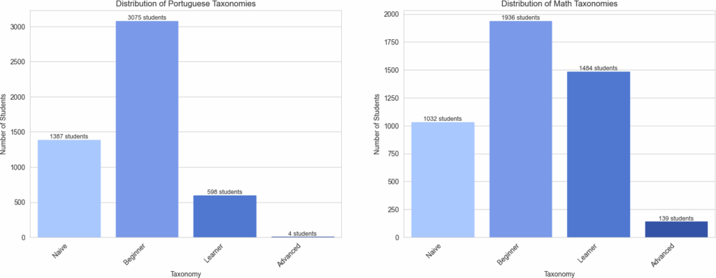Furthermore, the distribution of learning taxonomies presents interesting patterns. In Portuguese, the ”Beginner” category shows the highest concentration of students, while the ”Advanced” category is the least represented. In Math, a similar pattern is observed, with the ”Beginner” category predominating and ”Advanced” being the least common. This uneven distribution among learning categories suggests a need for differentiated pedagogical approaches to address the specific needs of each group (Figure 5).
